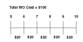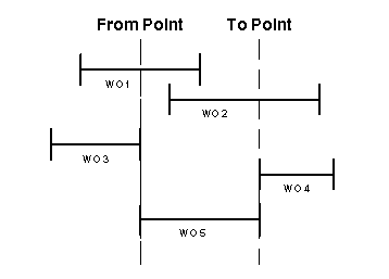 You want to view costs for a segment of I-85. WO 1, WO 2, WO 3, WO 4, and WO 5 all fall on or within the defined From Point and To Point. Therefore, the system displays all five work orders on the Costs page. The system displays WO 3 and WO 4 because they intersect at some point with the segment’s From Point and To Point; however, the system displays their costs as $0. The system calculates and displays the segmented costs for WO 1 and WO 2. The system displays the full cost of WO 5 because its length coincides exactly with the segment’s length.